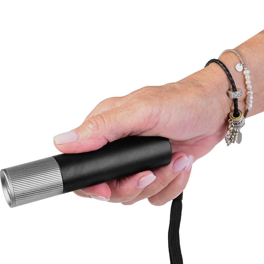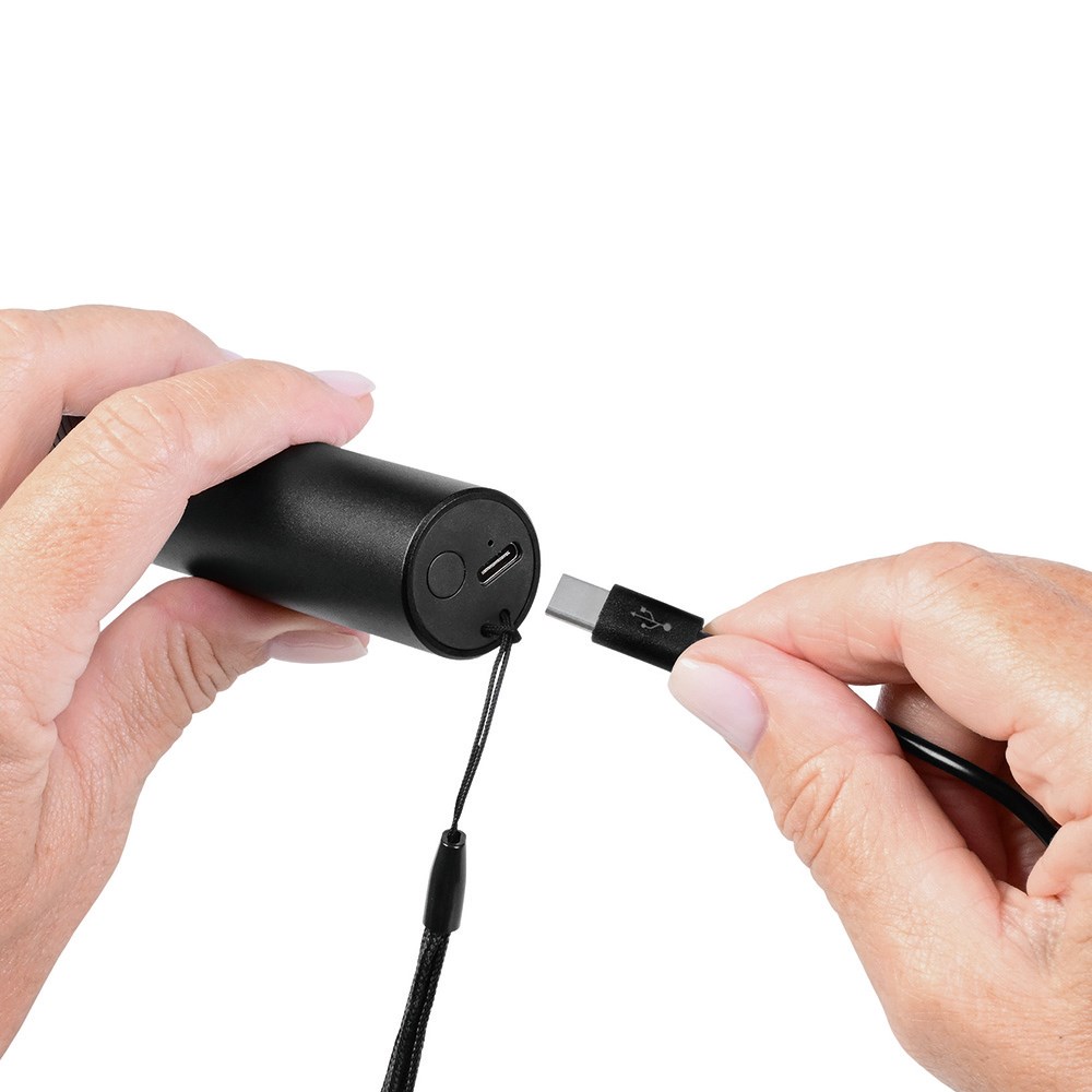 Praktische Taschenleuchte mit einer Reichweite von bis zu 300 Metern. Das Aufladen erfolgt über den USB-C-Ladeanschluss der Leuchte und entspricht damit der neuen EU-Norm für einen einheitlichen Ladestandard. Gehäuse: Aluminium schwarz/titan eloxiert. Leuchtmittel: 5 W SMD LED, Lichtwerte: 300 Lumen. Ladezeit: ca. 2-3 Stunden. Leuchtdauer: ca. 2-4 Stunden. Leuchtmodi: 100 % Power weißes Licht / 50 % Power weißes Licht / Strobe weißes Licht. Equipment: fokussierbar durch Herausziehen des Leuchtenkopfes, Ladekontroll-LED, Handschlaufe, USB (Typ A) / USB (Typ C) Ladekabel (50 cm Länge). Schutzklasse: IP42. Stromversorgung: 3,7V 1200mAh Li-Ionen Akku Typ 18650 (inkl.). Verpackung: schwarze Geschenkverpackung.