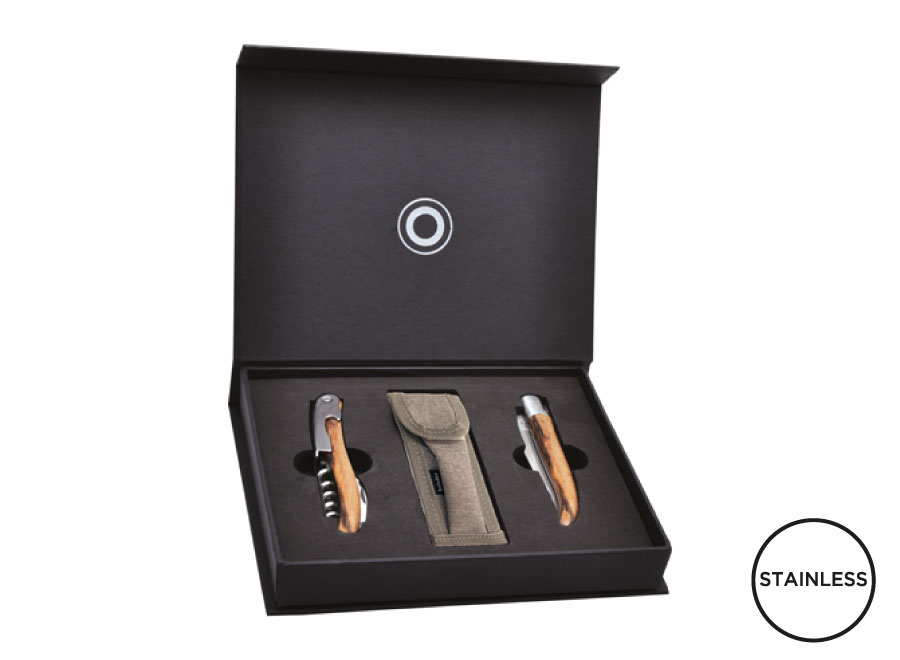 Geschenkset bestehend aus einem 11cm klappbaren Messer und einem Kellnermesser. Griff aus Zebranoholz.